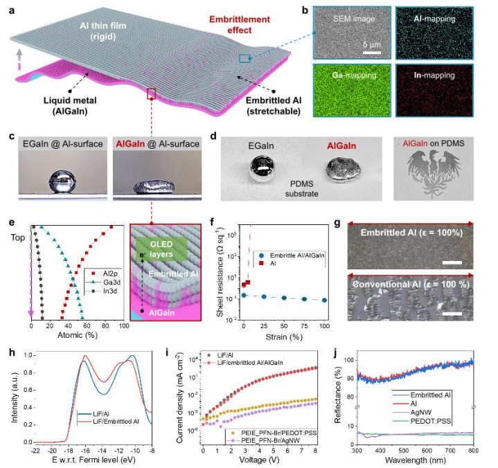 理想的阴极需要使用铝这样的低功函数金属,但是铝本身是刚性的。为此,刘伟从液态金属脆化效应中找到灵感。比如,在一大块铝上滴一滴液态金属,一段时间后铝块会变得酥脆和粉化。他觉得人们常常想尽方法想避免的脆化效应反而是将刚性铝转化成可拉伸铝的巧妙方法。