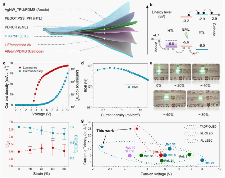 当这条全新的“柔性电子高速公路”即 PTG75D 聚合物,遇到“柔性电子发射站”即脆化铝阴极的时候,并且与已有的高性能可拉伸发光层和阳极结合时,便发生了本文开头提到的性能。
