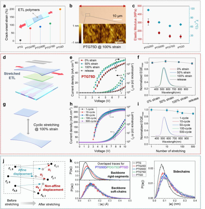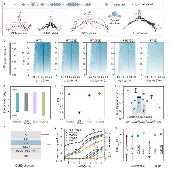 更神奇的是,通过量子化学计算模拟,他看到了这些聚合物在拉伸时的微观世界的变化:柔软的烷基链会和应变方向进行对齐,并会像润滑剂一样带动周围刚性的三嗪单元一起温和地移动,从而能够避免带有破坏性的开裂。这使得基于该材料的 OLED 器件在经历 100% 应变拉伸甚至 500 次重复拉伸之后,性能依然保持稳定。