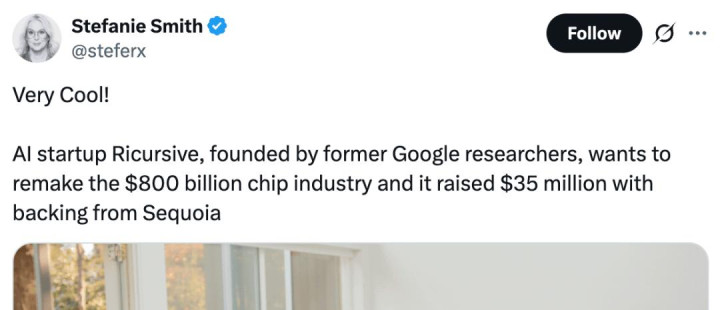 而此消息一经传出,很多网友对此创意表达了关注。其中,红杉资本合伙人斯蒂芬妮・詹更是认为,Ricursive Intelligence 是真正开创了人工智能芯片设计这一领域的先驱,「开拓一个全新的领域,让更多人能够为自己的专属应用场景设计新型芯片。」「希望重塑价值 8000 亿美元的芯片行业。」